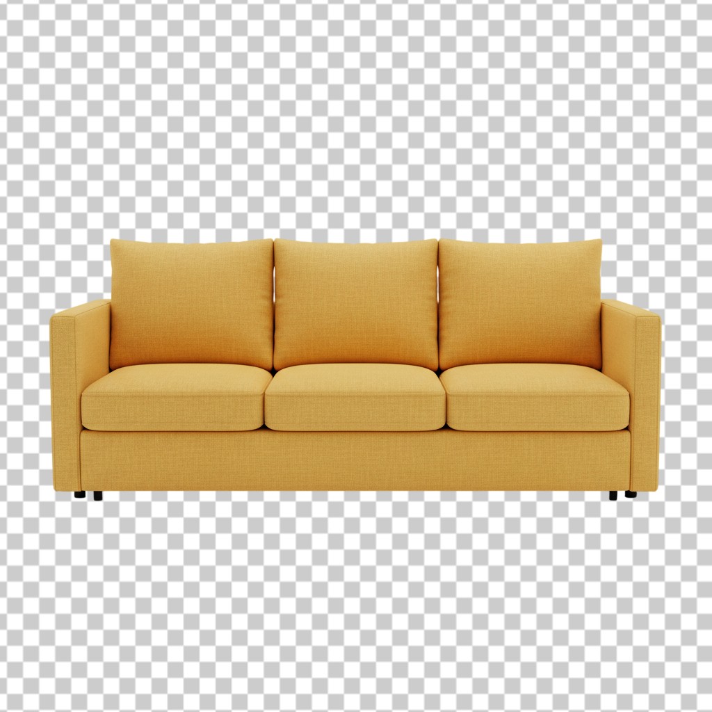 Bright Yellow Comfortable Fabric Sofa with Three Cushions PNG Transparent Background