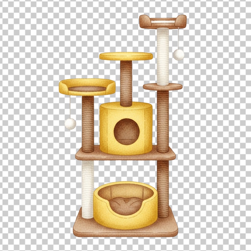 Wooden Cat Tree Tower with Multiple Levels and Scratches PNG Transparent Background