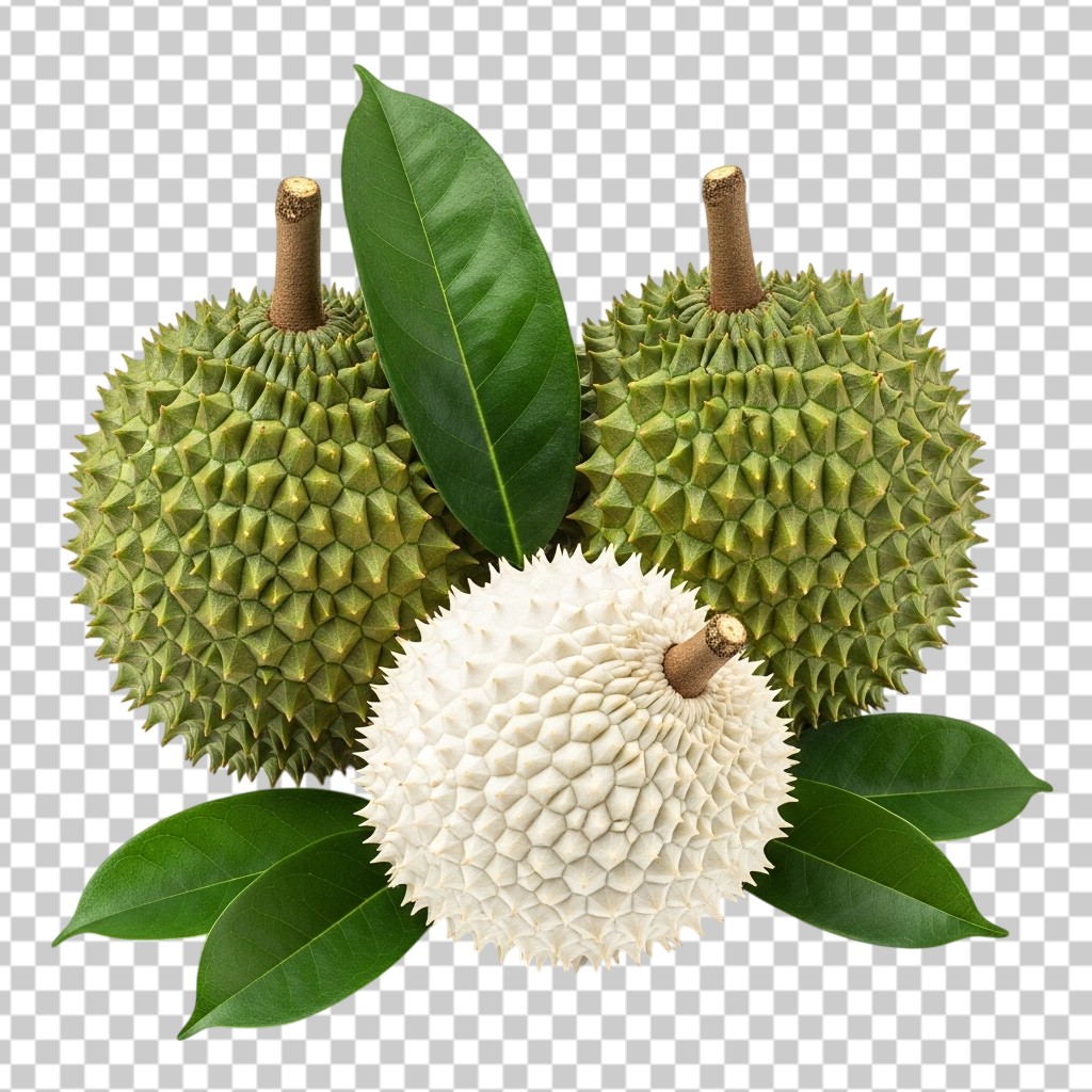 Whole and Cut Exotic Durian Fruit with Spiky Green Skin PNG Transparent Background