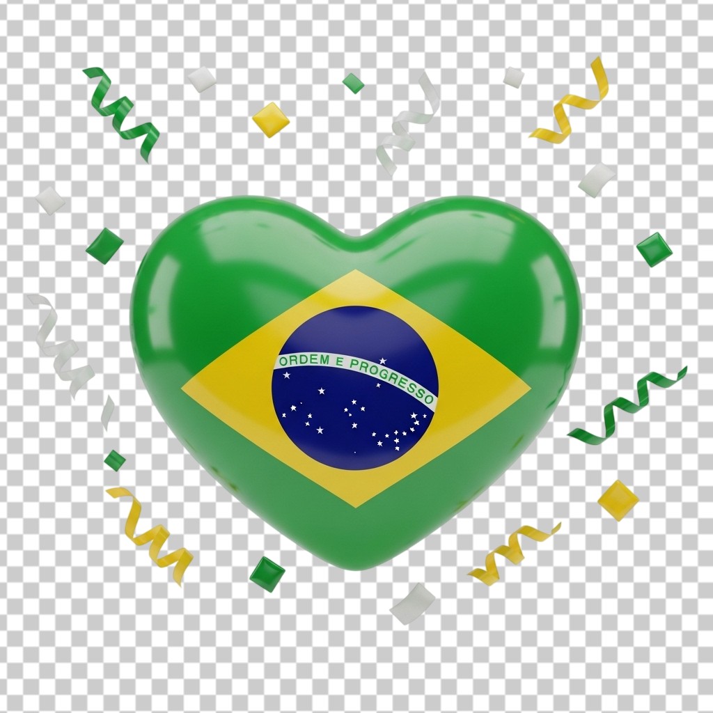 3D Brazil Flag Heart Shape with Celebration Confetti PNG Transparent Background