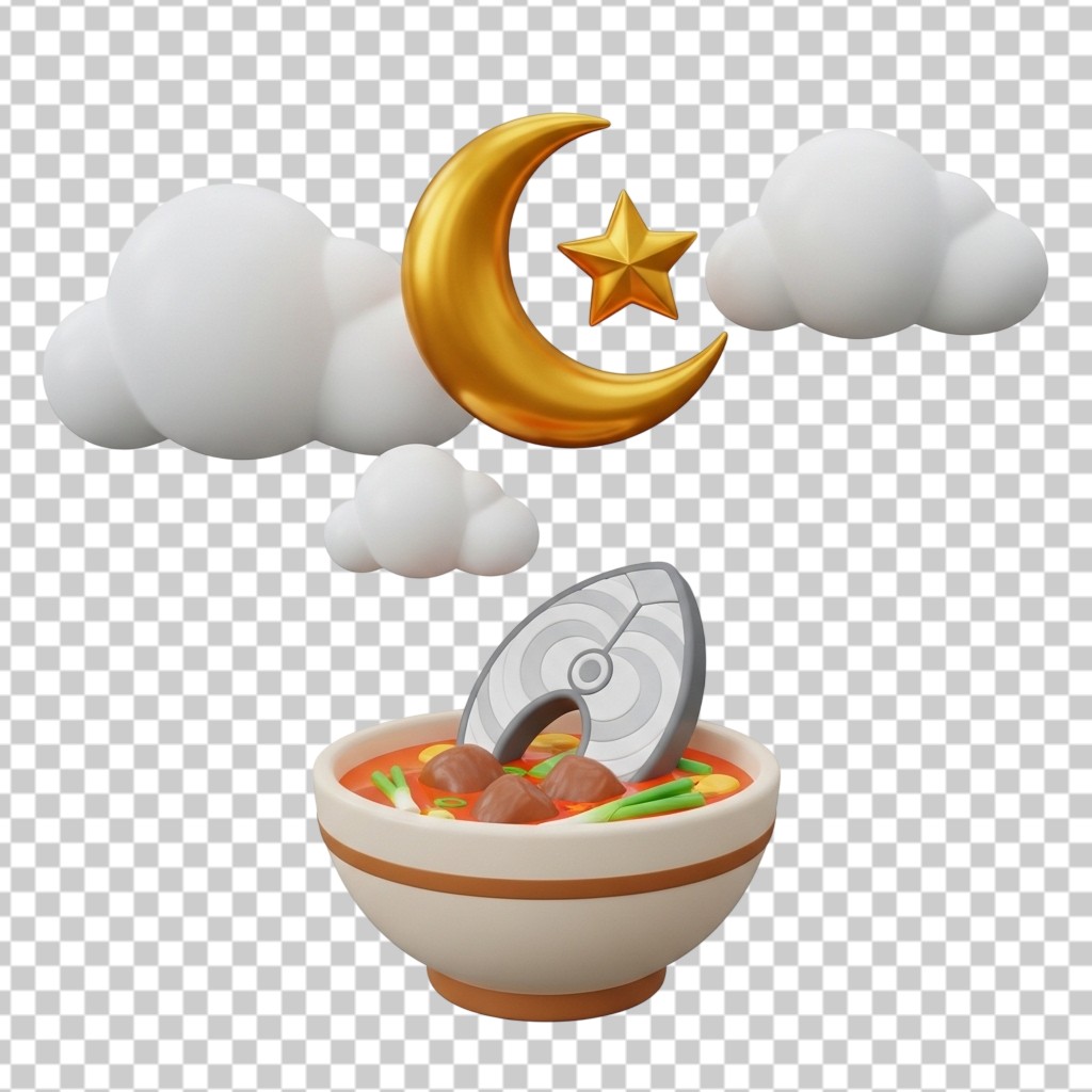 Bowl of Ramadan Soup with Sliced Moon and Star Decoration PNG Transparent Background