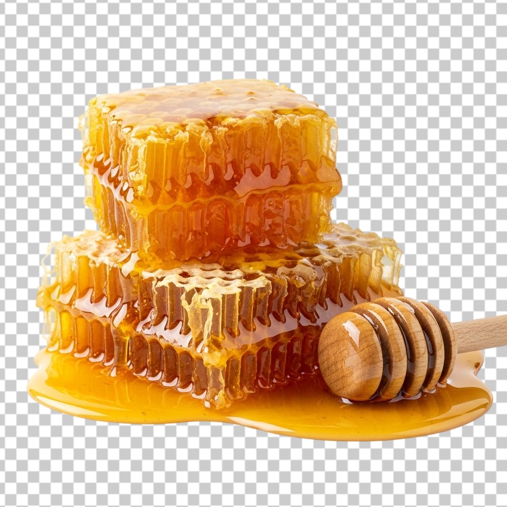 Natural Golden Honeycomb Stack with Wooden Honey Dipper PNG Transparent Background