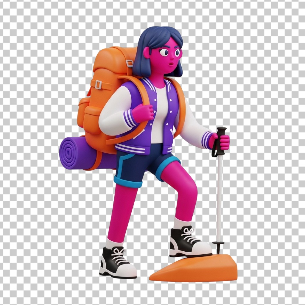 3D Character of a Female Hiker with Backpack and Walking Stick PNG Transparent Background