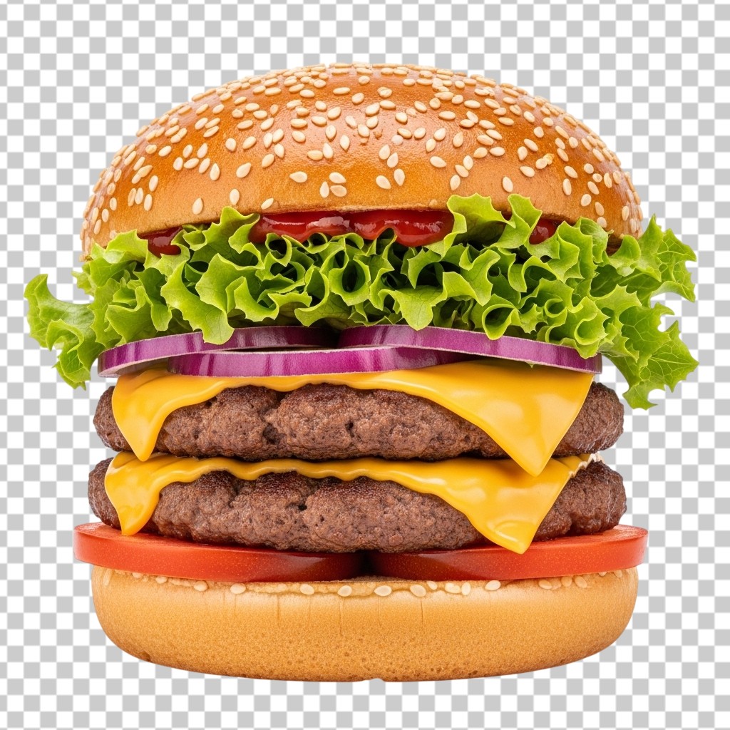 Large Appetizing Double Cheeseburger with Multiple Layers of Toppings and Sauce PNG Transparent Background