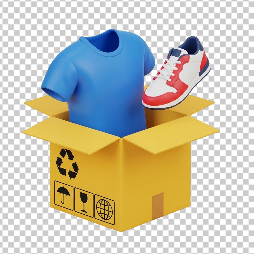 3D Cardboard Donation Box with Clothes and Shoes PNG Transparent Background