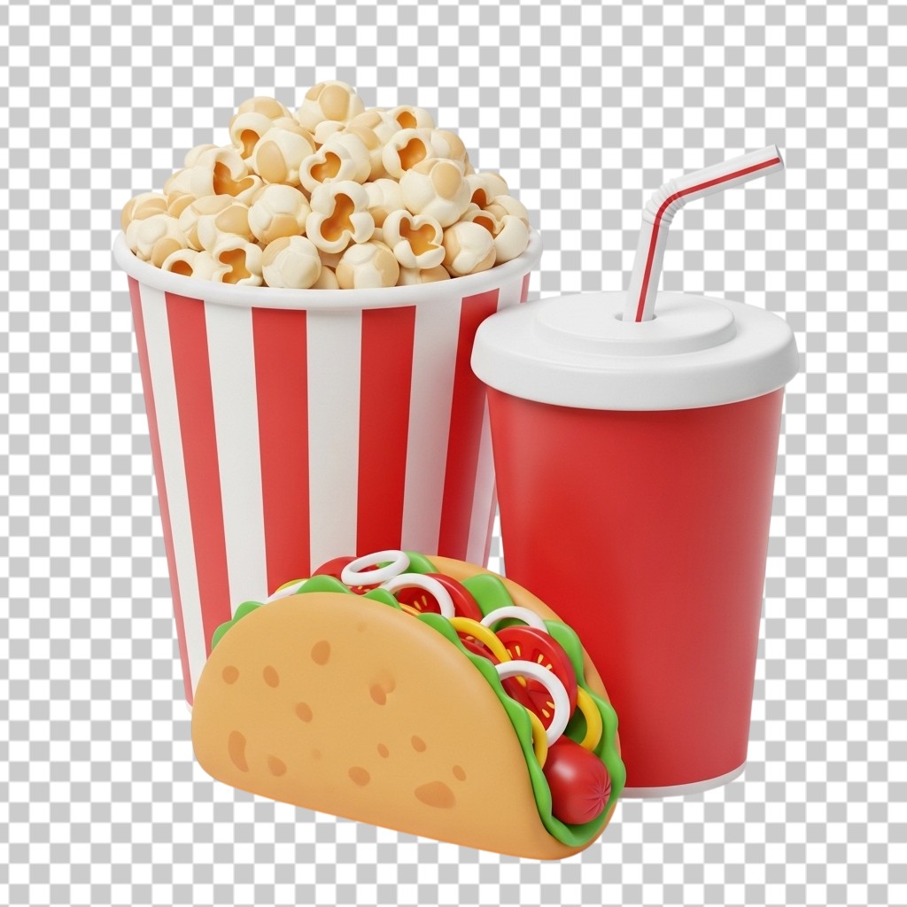3D Cinema Snacks Set with Popcorn Soda and Taco PNG Transparent Background