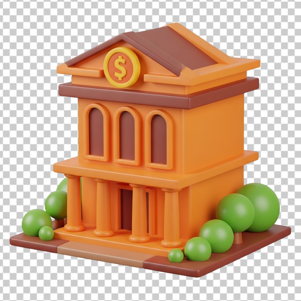 3D Classic Bank Building with Gold Dollar Sign PNG Transparent Background