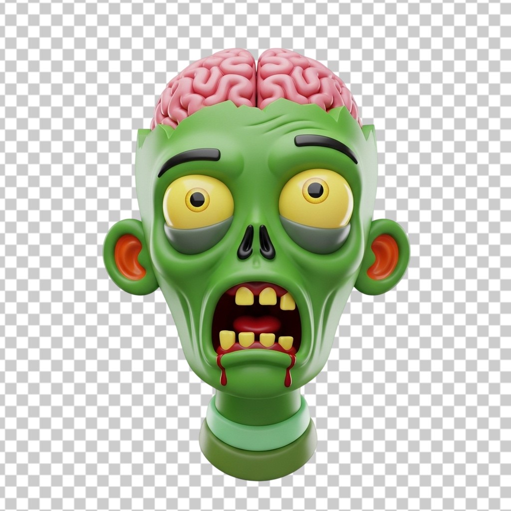 Scary 3D Zombie Head Character with Visible Brain and Yellow Eyes PNG Transparent Background