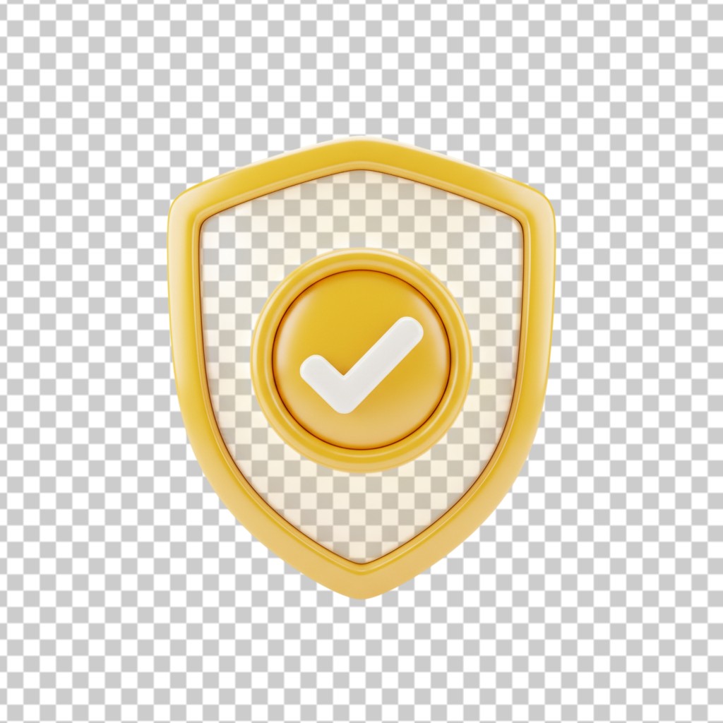 Golden 3D Security Shield Icon with Checkmark Symbol PNG Transparent Background