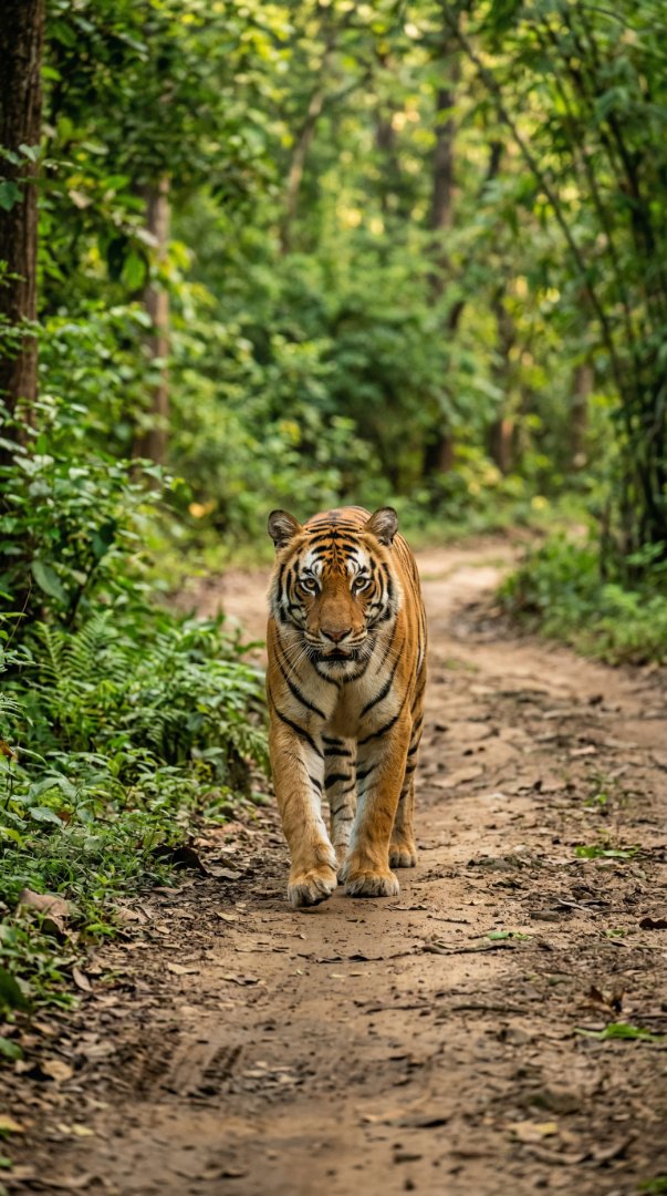 A majestic view of a powerful wild tiger making its way down an unpaved road in its natural habitat.