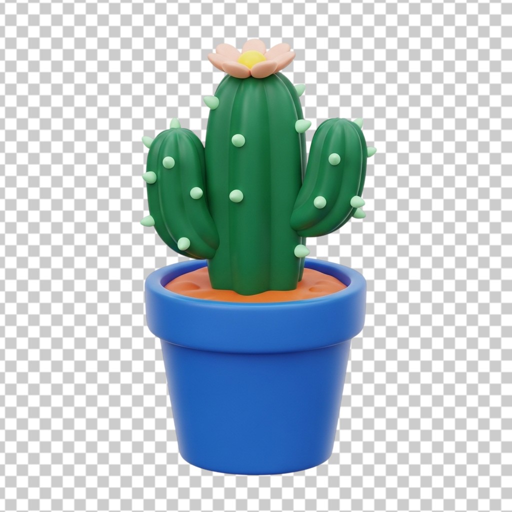 Cactus Plant in Blue Pot with Flower 3D Rendering PNG Transparent Background