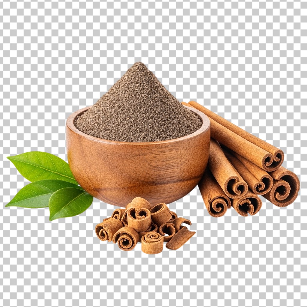 Fresh Cinnamon Powder in a Wooden Bowl with Cinnamon Sticks PNG Transparent Background