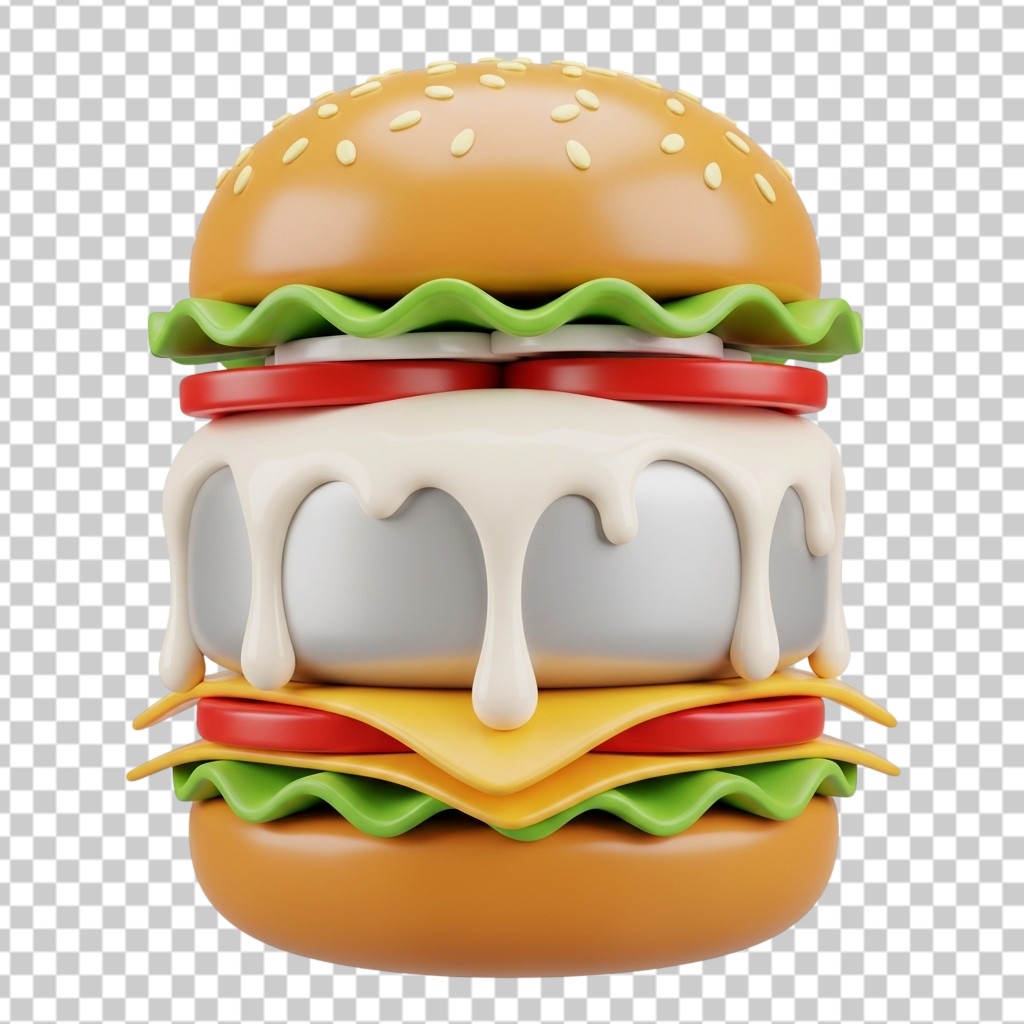3D Large Burger with Creamy White Melting Sauce PNG Transparent Background