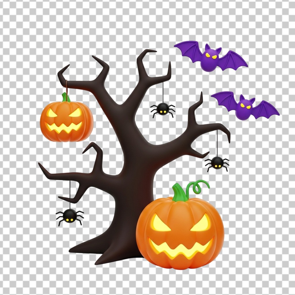 3D Haunted Halloween Dead Tree with Pumpkins and Bats PNG Transparent Background