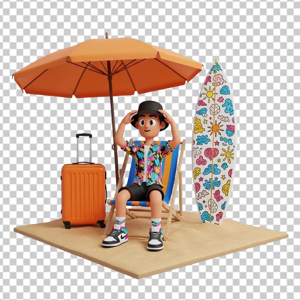 3D Character Sitting on Beach with Umbrella and Surfboard PNG Transparent Background