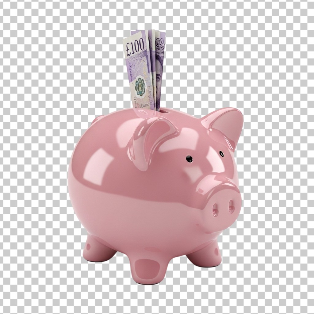 Cute Pink Ceramic Piggy Bank with British Pound Note Money Saving PNG Transparent Background