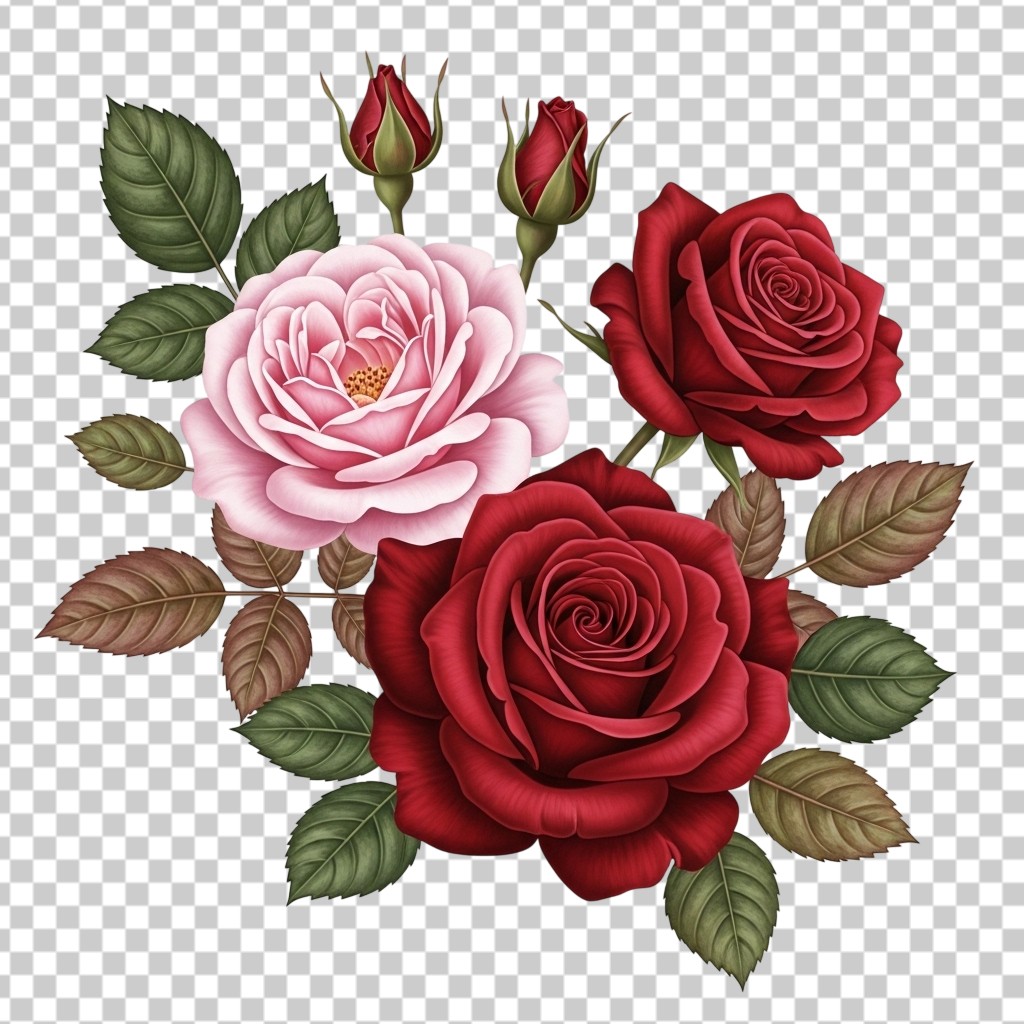 Beautiful Bouquet of Red and Pink Roses with Green Leaves Floral Design PNG Transparent Background