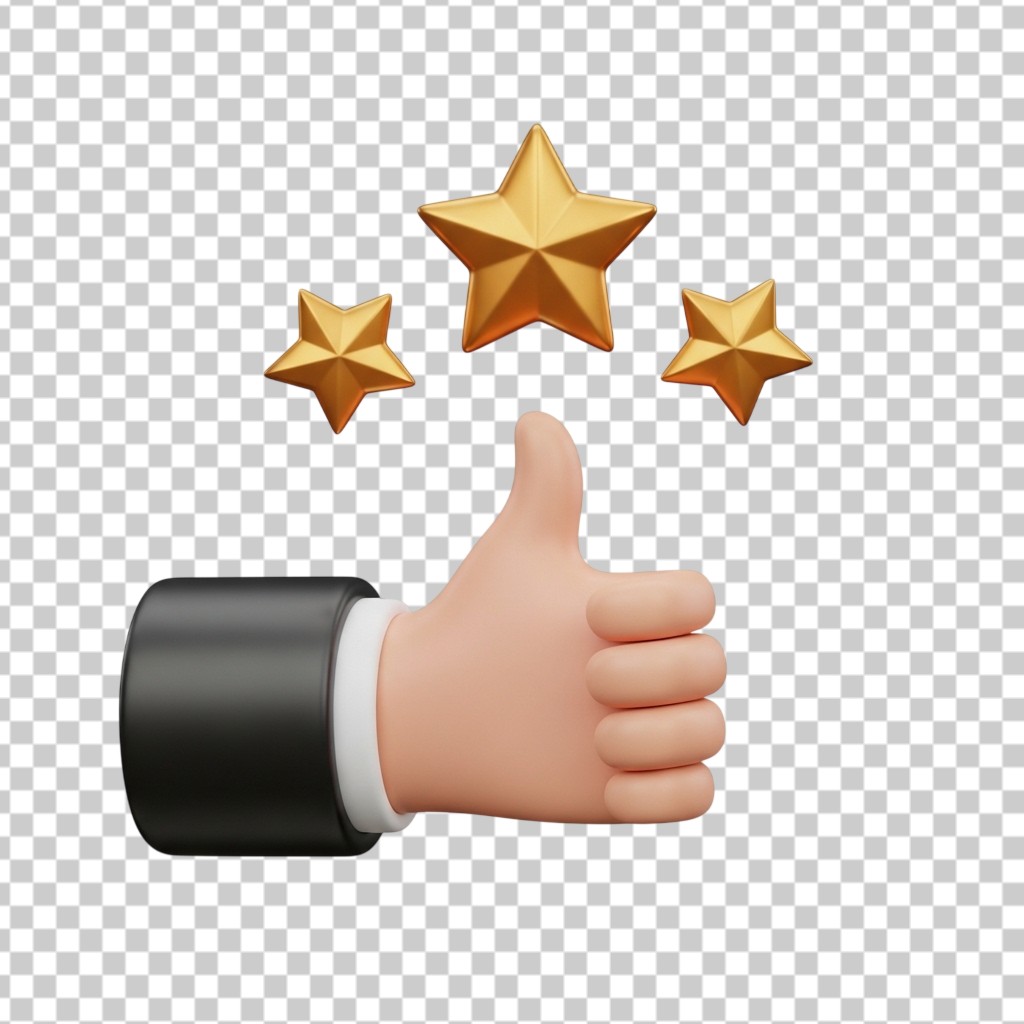 3D Thumbs Up Hand Gesture with Three Golden Rating Stars PNG Transparent Background
