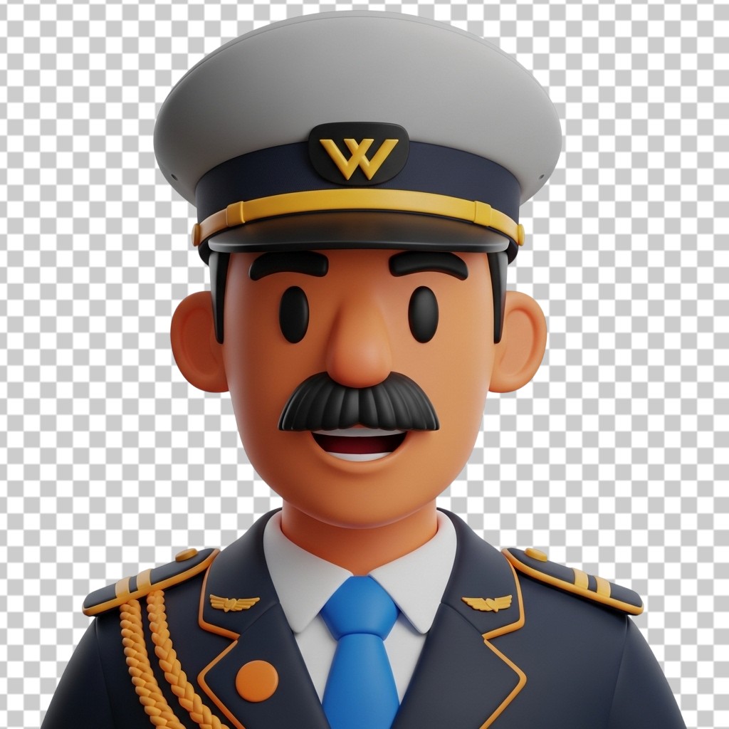 3D Male Airline Pilot Character in Uniform with Mustache PNG Transparent Background