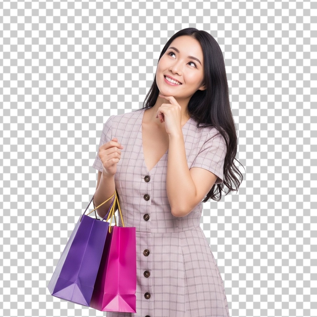 Young Woman Carrying Colorful Shopping Bags and Thinking PNG Transparent Background