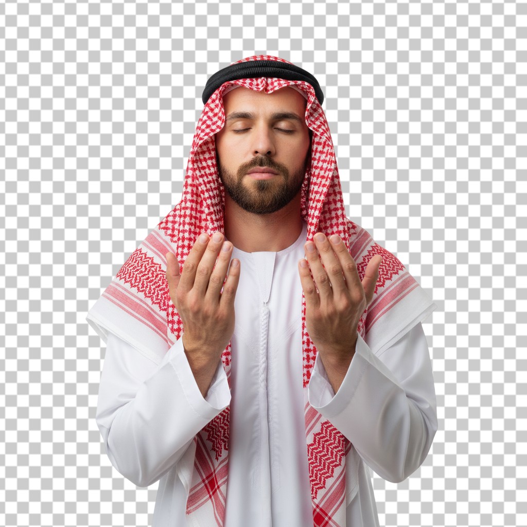 Spiritual Arab Man in Traditional Attire Praying with Open Hands and Closed Eyes PNG Transparent Background