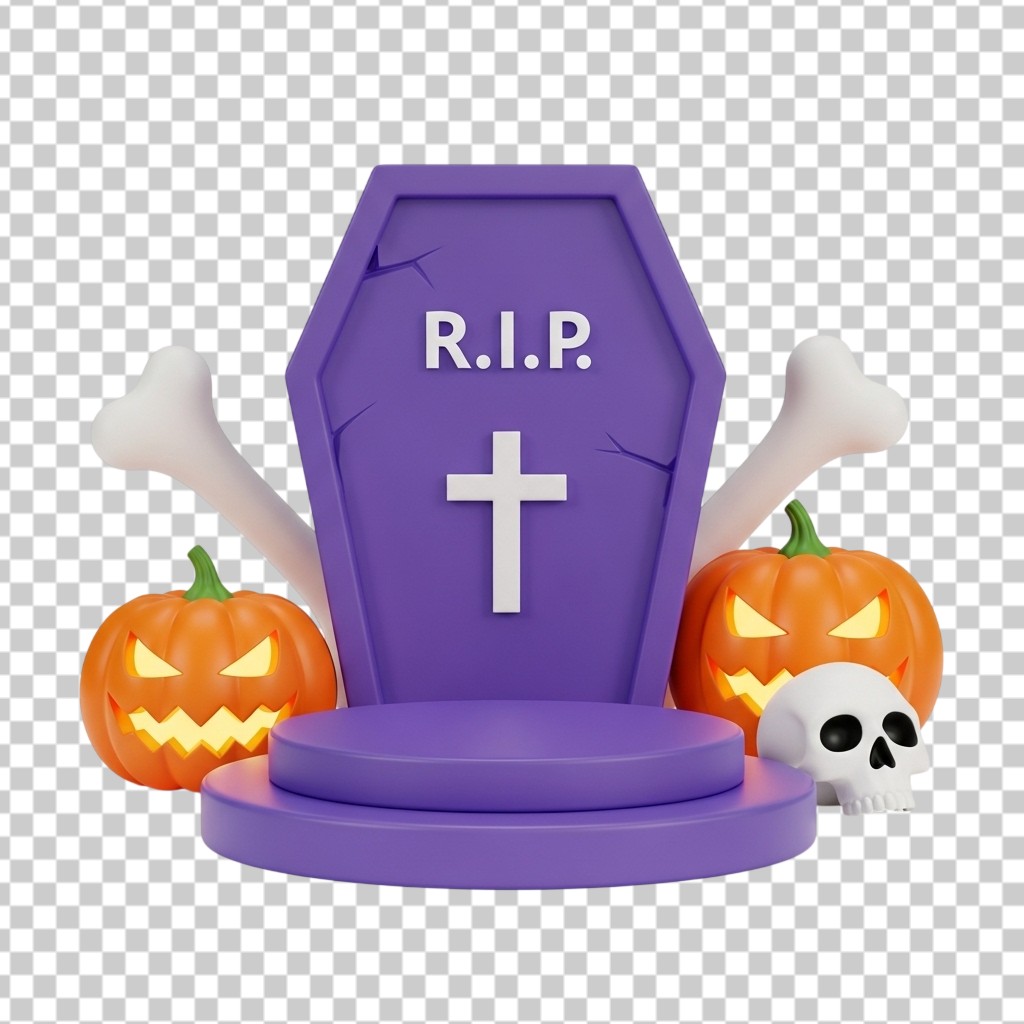 3D Halloween Grave R.I.P Tombstone with Pumpkins and Skulls PNG Transparent Background