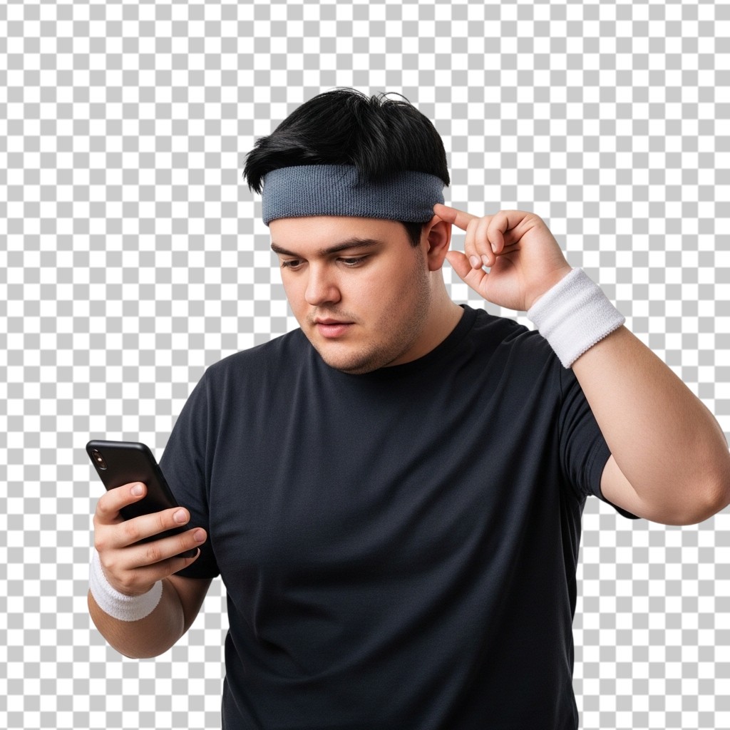 Man in Black Sports Outfit Using a Smartphone and Wearing Earbuds PNG Transparent Background