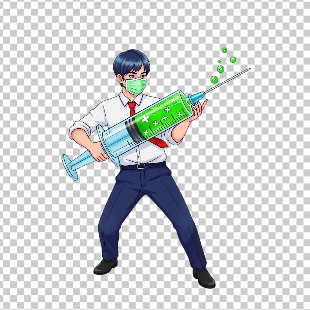 Male Doctor Character Holding a Large Medical Syringe PNG Transparent Background