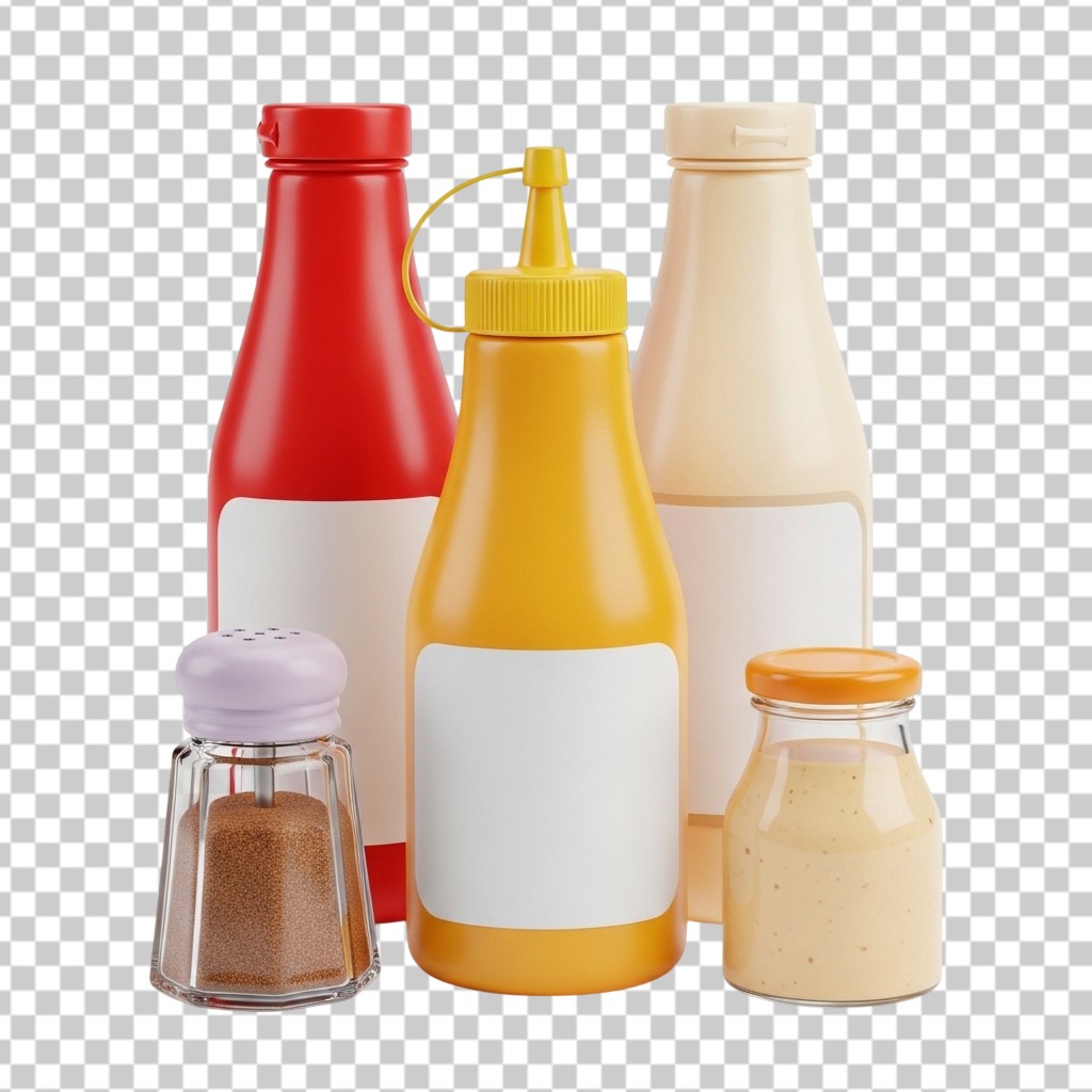 Set of Condiment Bottles Ketchup Mustard and Mayo 3D Kitchen PNG Transparent Background