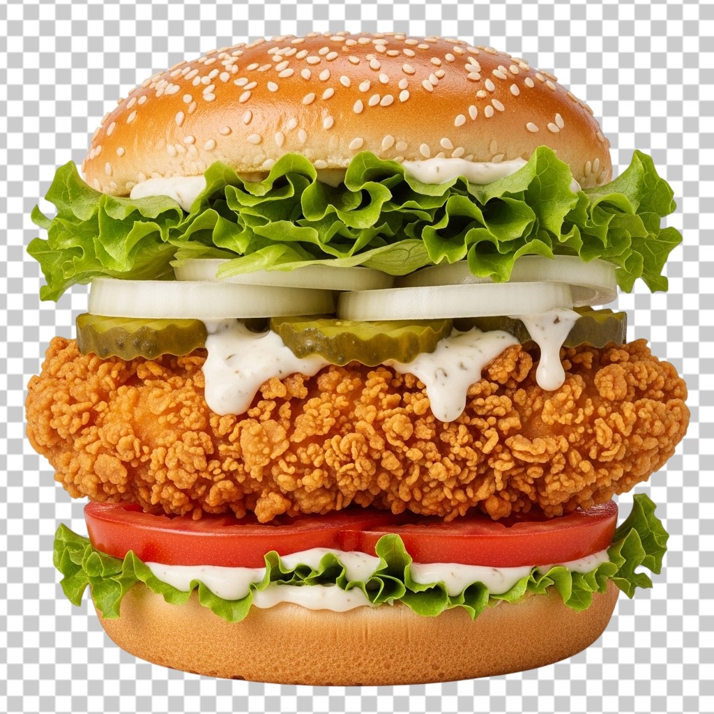 Crispy Fried Chicken Burger with Cheese Onion and Pickles PNG Transparent Background