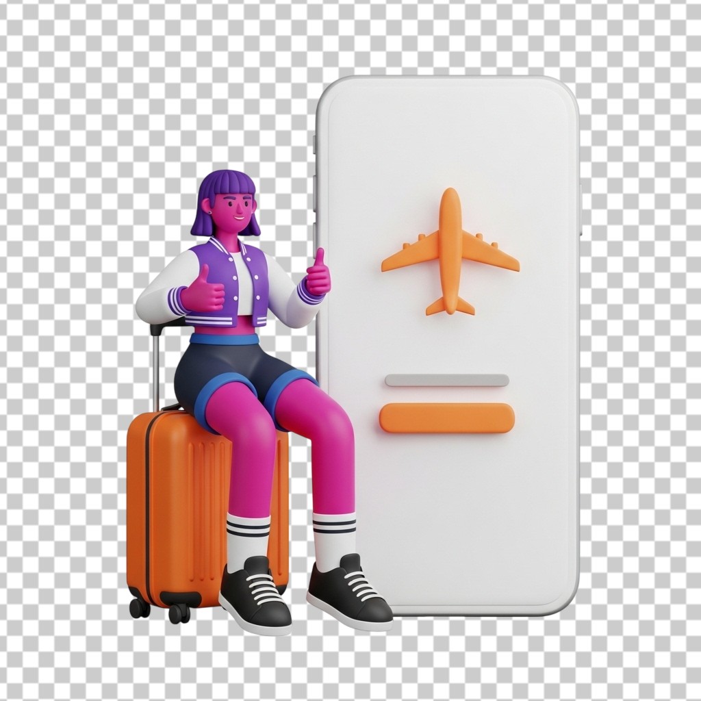 3D Woman Traveler Sitting on Luggage with Flight Ticket PNG Transparent Background