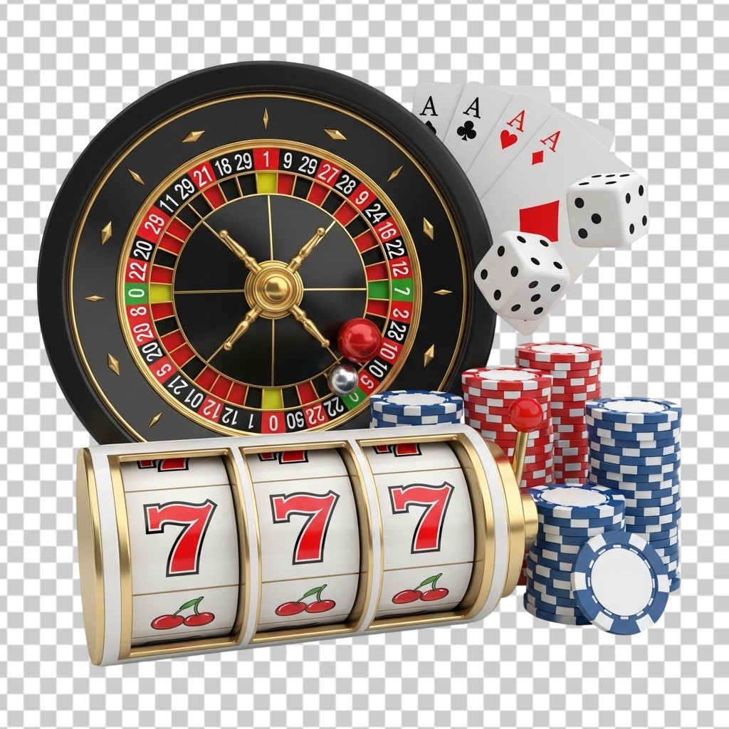Casino Gambling Elements with Roulette Wheel and Slot Machine PNG Transparent Background