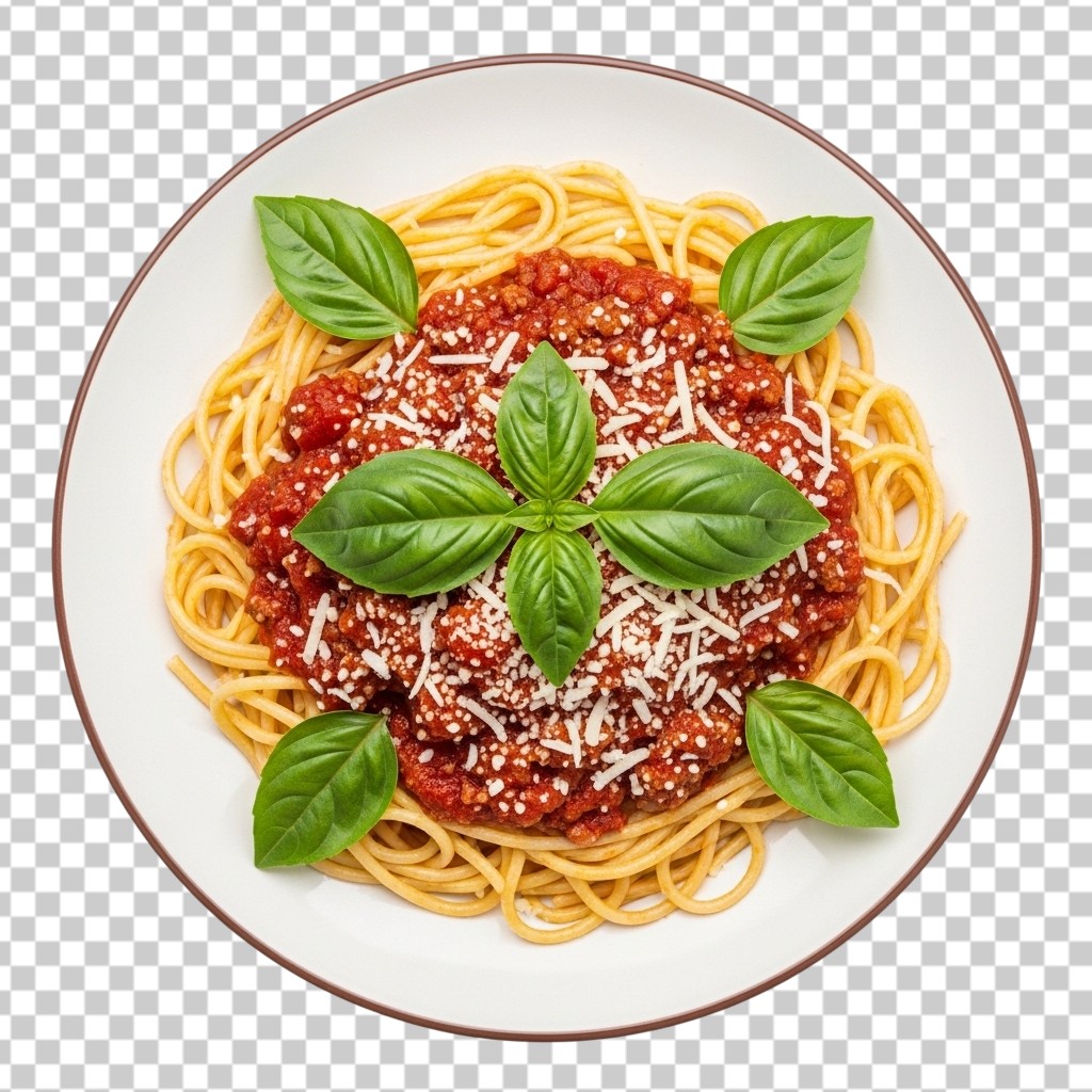 Delicious Spaghetti Bolognese with Tomato Meat Sauce and Fresh Basil PNG Transparent Background