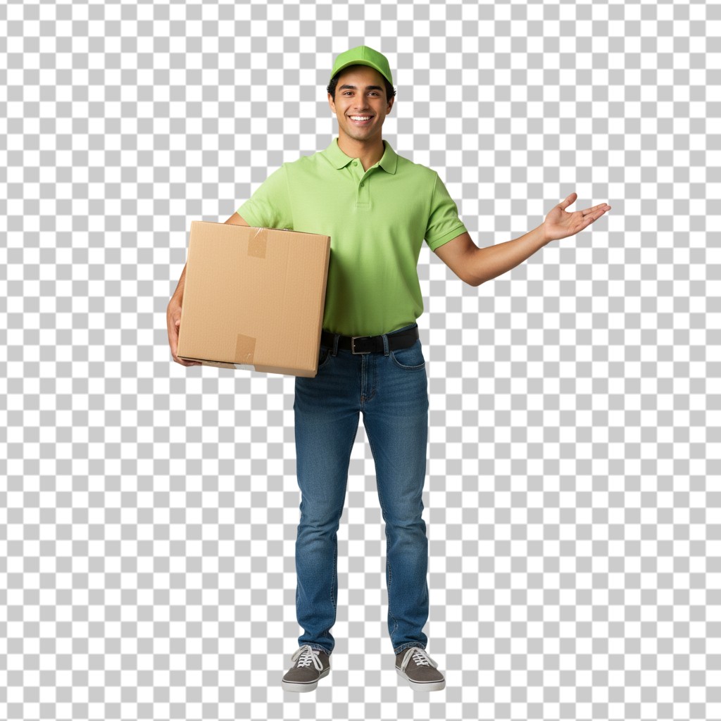 Male delivery worker in green shirt holding box and gesturing PNG Transparent Background,Professionals,Business People