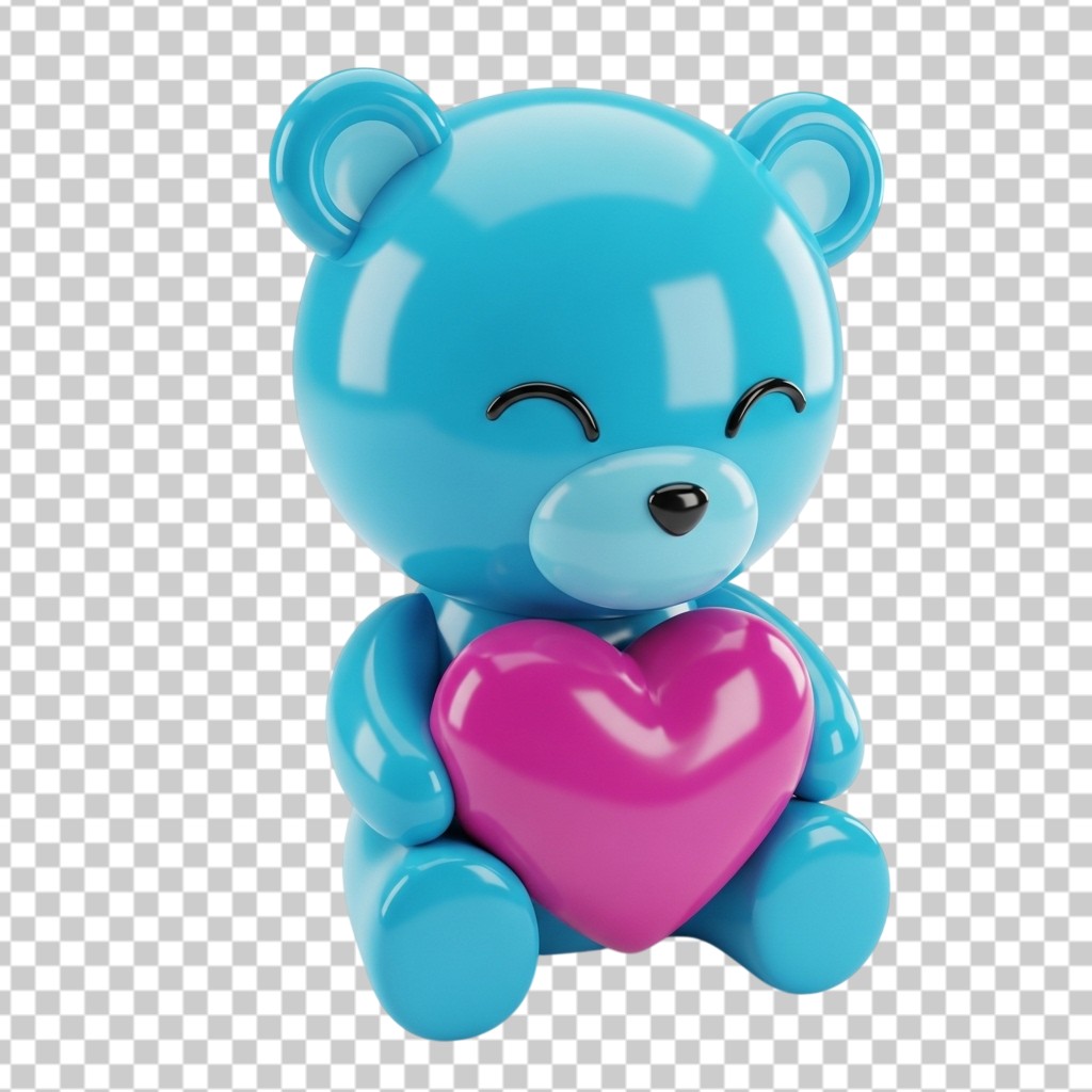 3D Blue Shiny Teddy Bear Holding a Pink Heart PNG Transparent Background