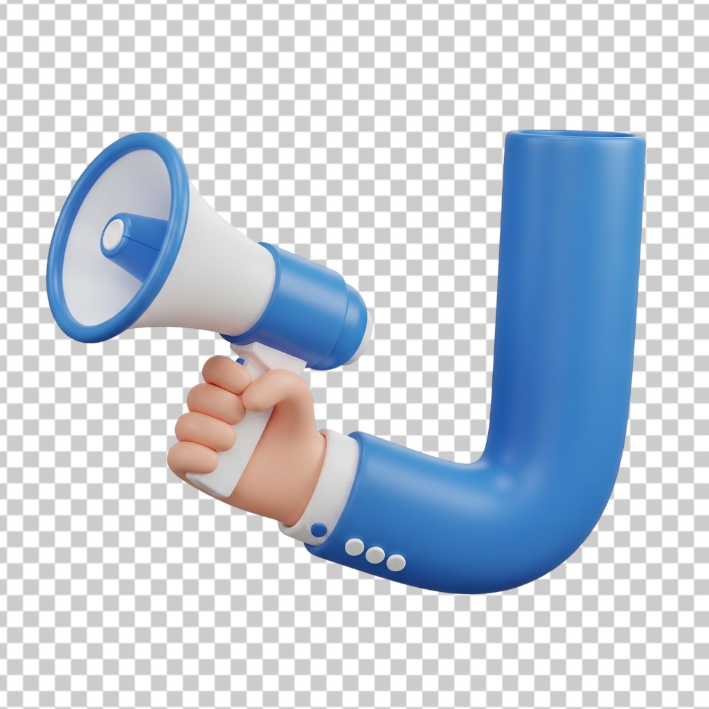 3D Stylized Hand Holding Blue and White Megaphone Speaker PNG Transparent Background
