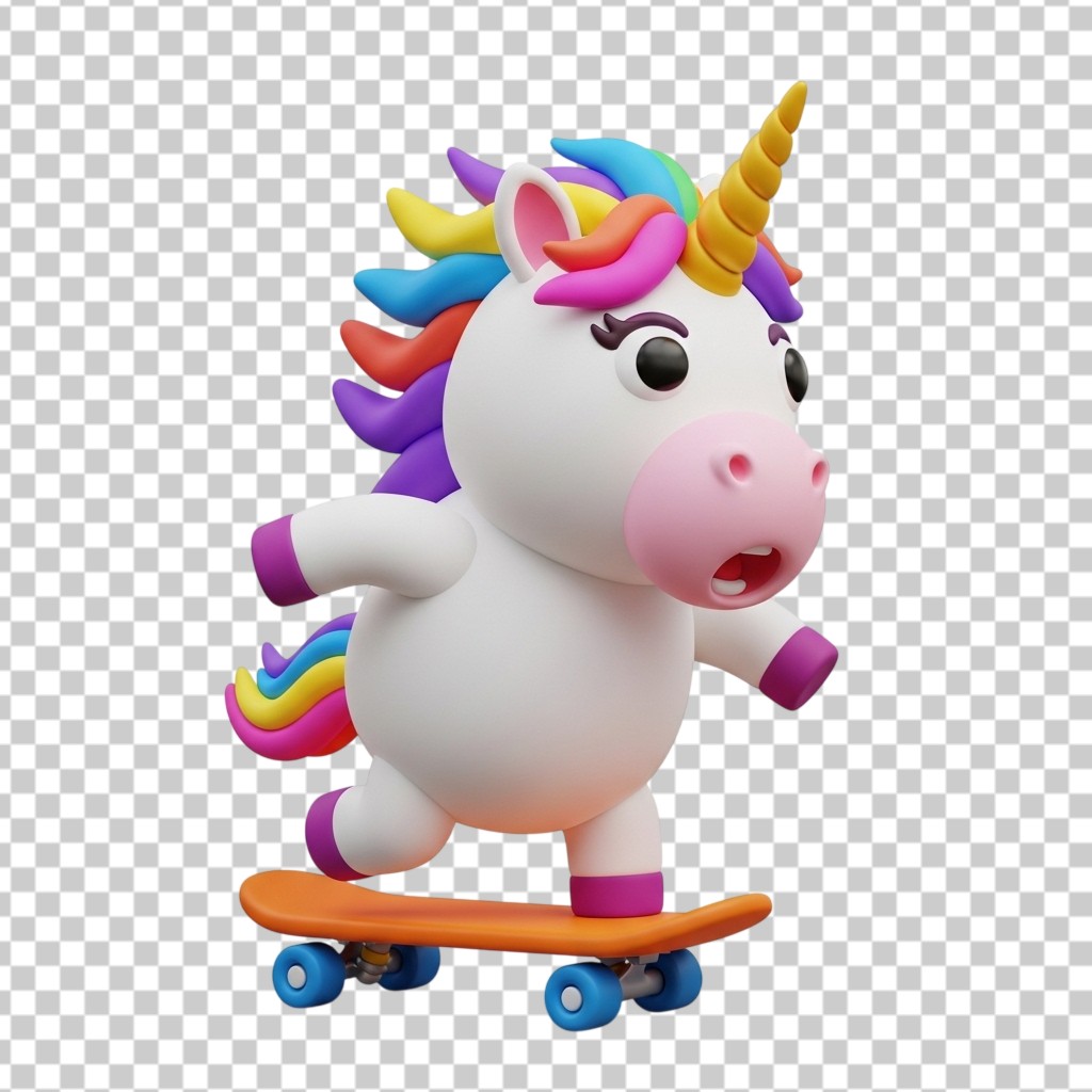 3D Cute Unicorn Character on Skateboard Illustration PNG Transparent Background