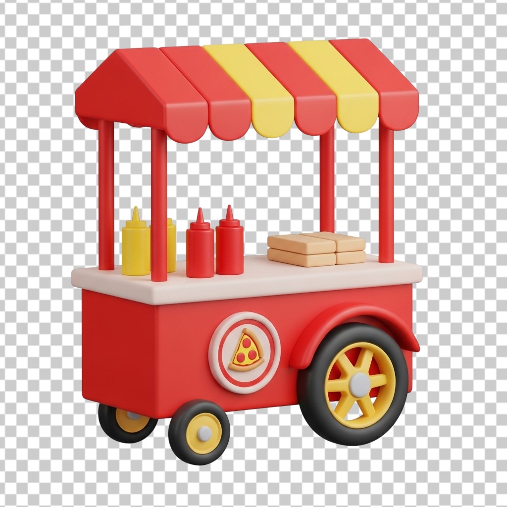3D Red and Yellow Hot Dog Food Stall Cart on Wheels PNG Transparent Background