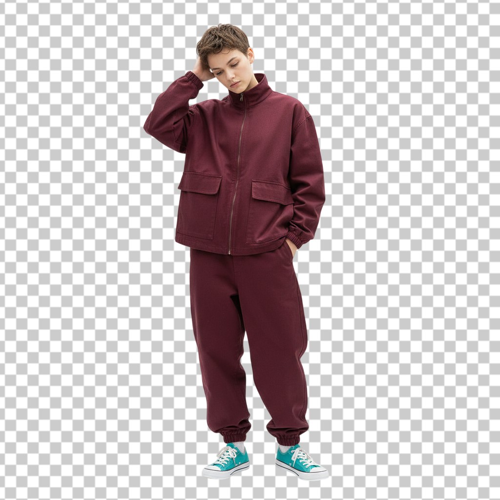 Young man in maroon tracksuit looking down PNG Transparent Background,People,Fashion & Lifestyle