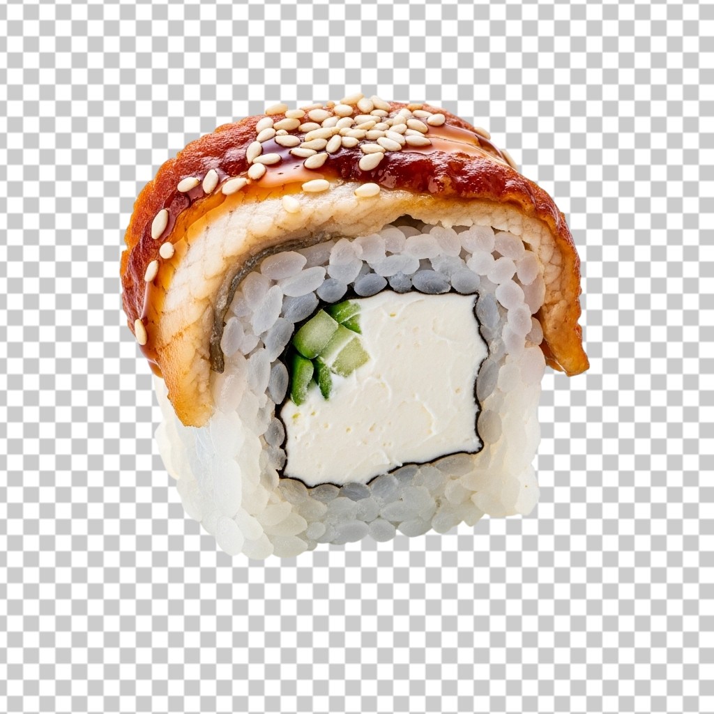 Single Piece of Sushi Roll with Eel and Cream Cheese PNG Transparent Background