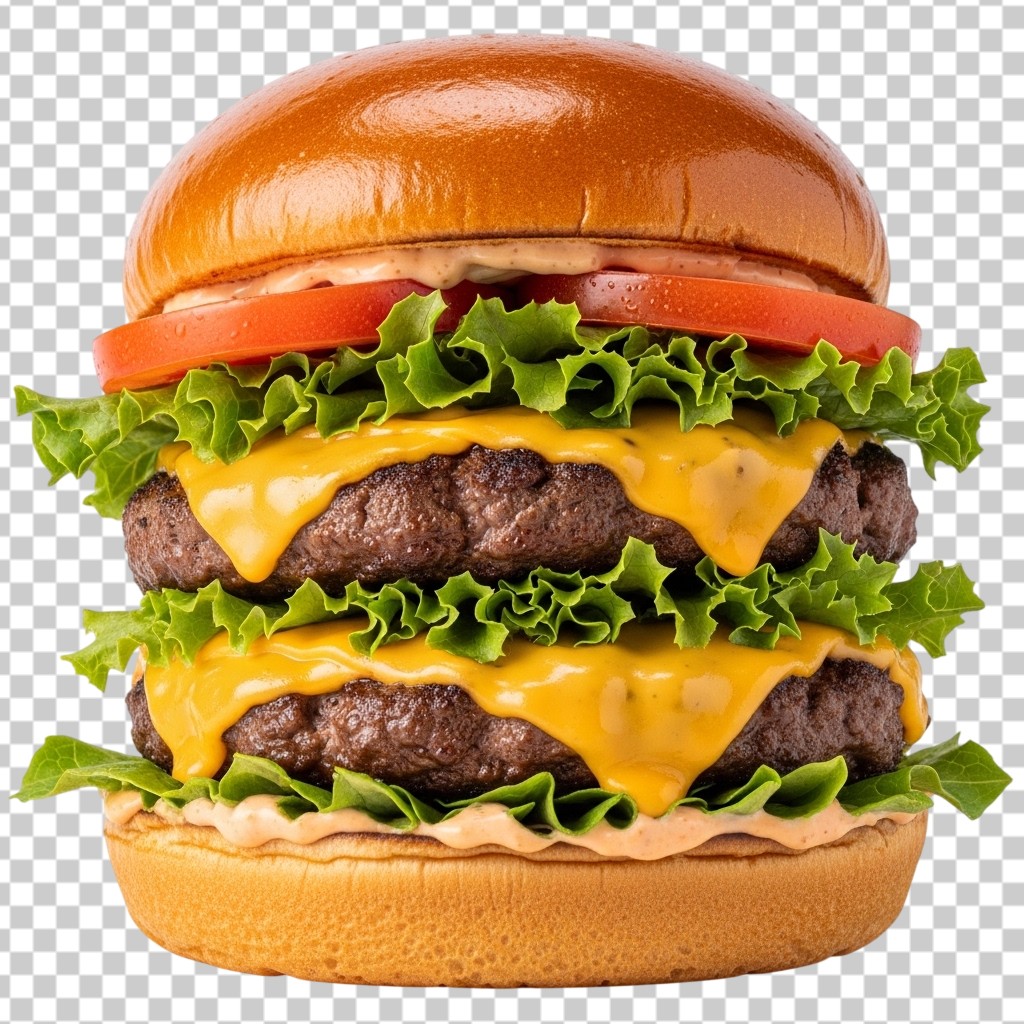 Delicious Double Patty Cheeseburger with Melting Cheese and Fresh Veggies PNG Transparent Background