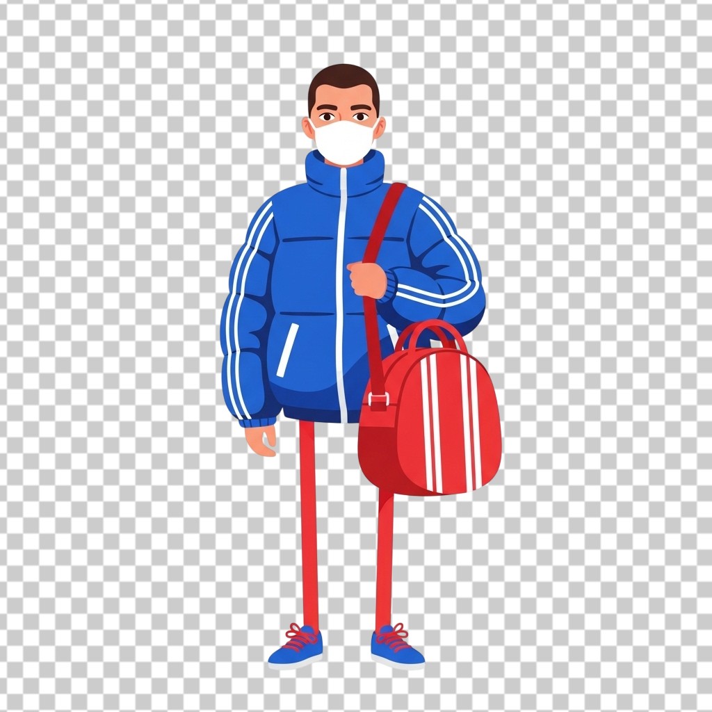 Cartoon Character Wearing Blue Puffer Jacket and Mask Carrying Bag PNG Transparent Background
