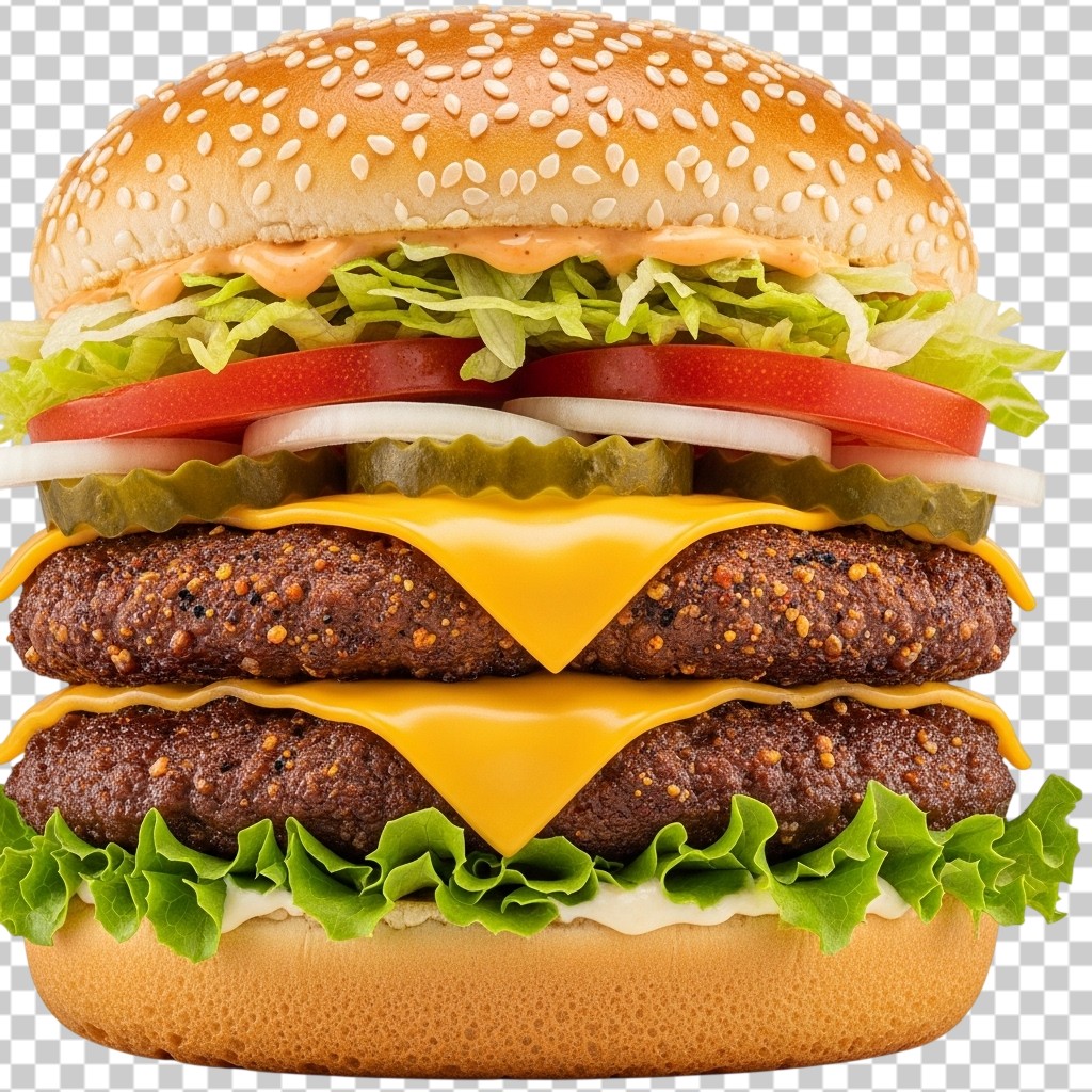 Large Double Layer Beef Burger with Cheese and Salad PNG Transparent Background