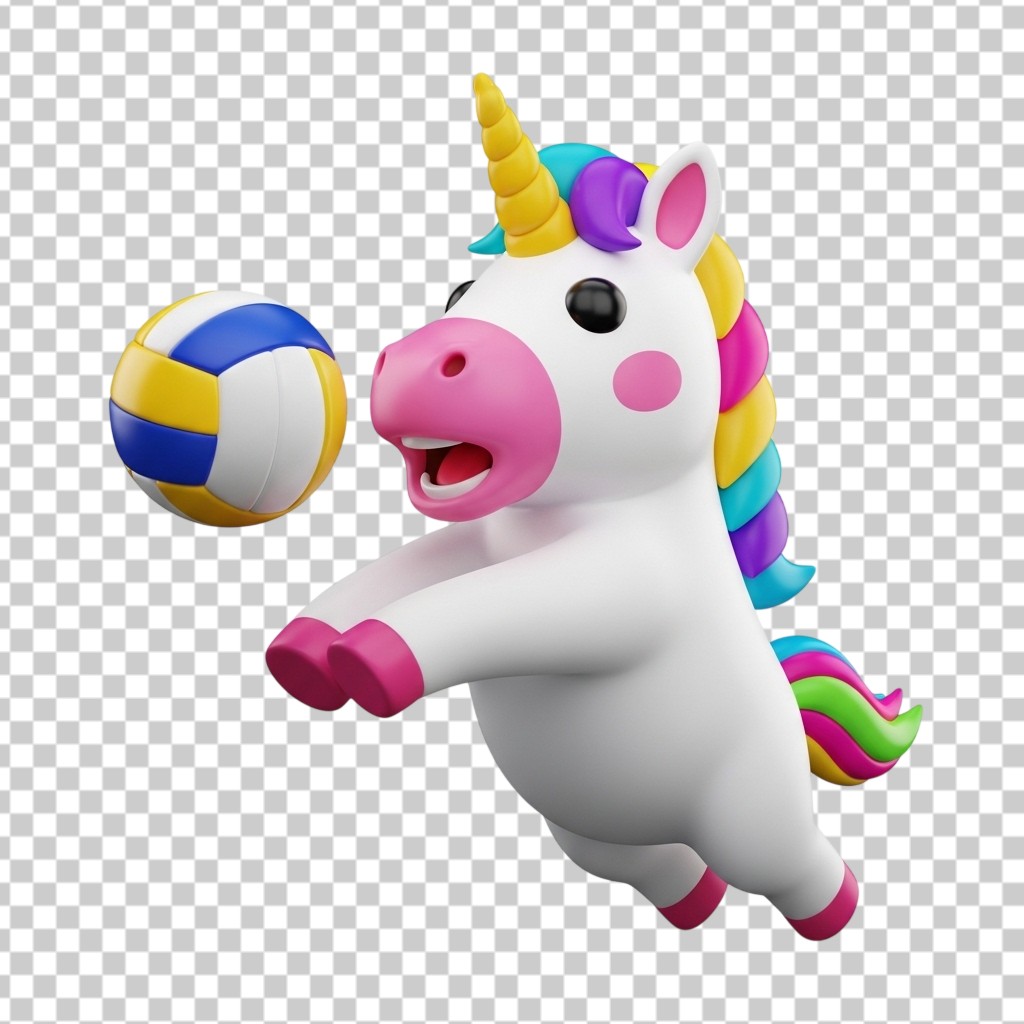 3D Cute White Unicorn Character Playing Volleyball PNG Transparent Background