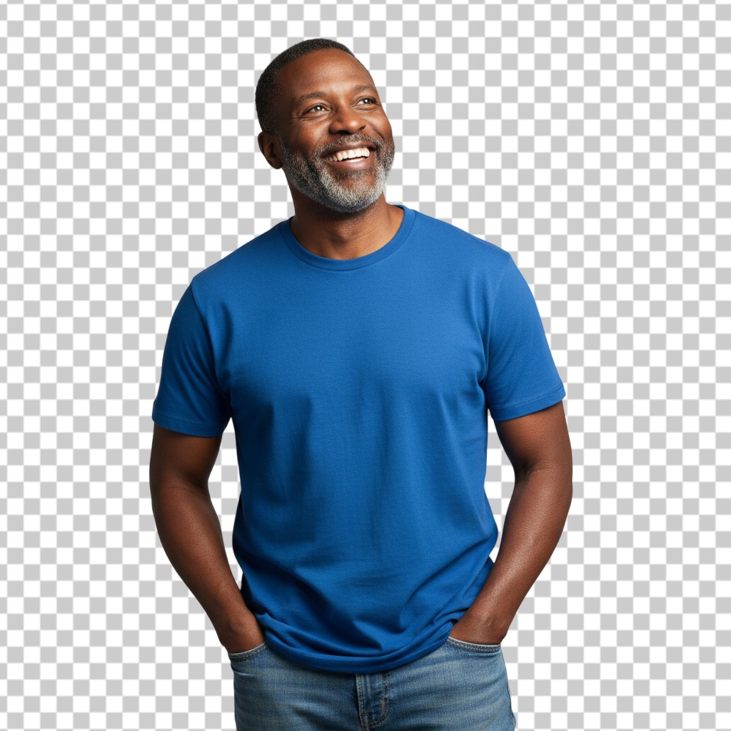 Mature man in blue t-shirt looking up with a smile PNG Transparent Background,People