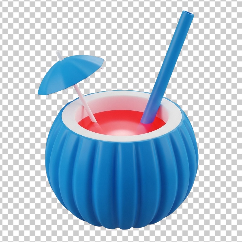 3D Blue Coconut Tropical Summer Drink with Straw Illustration PNG Transparent Background