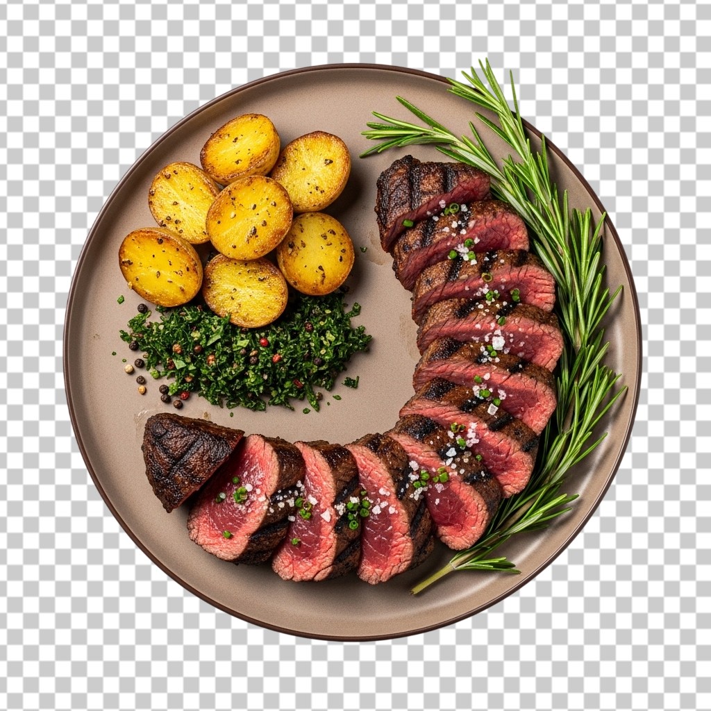Gourmet Sliced Beef Steak with Roasted Potatoes PNG Transparent Background