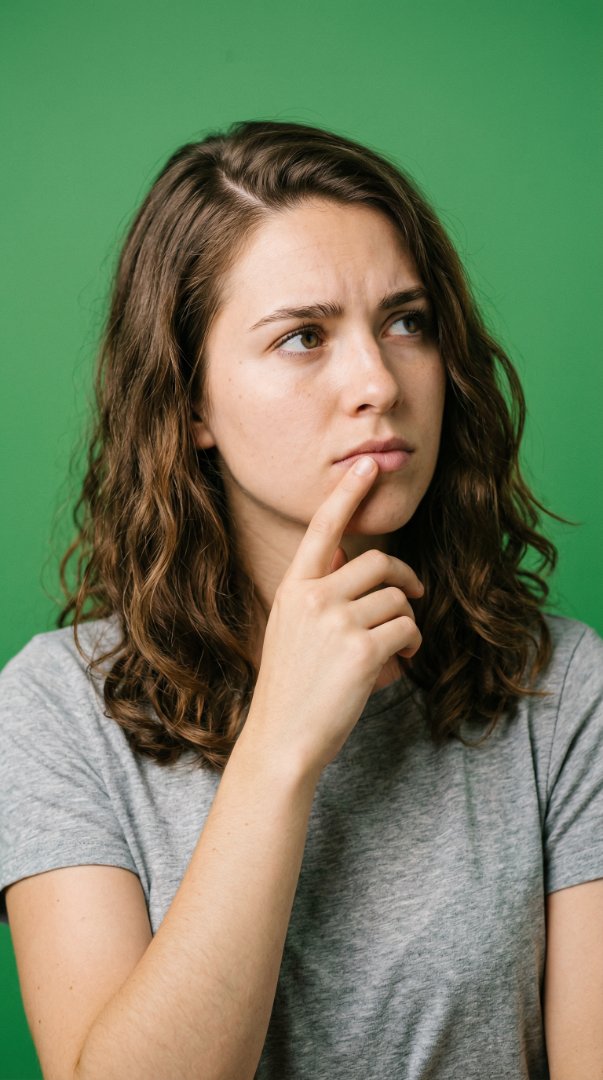 A close-up portrait of a thoughtful Caucasian woman looking away with a questioning expression.