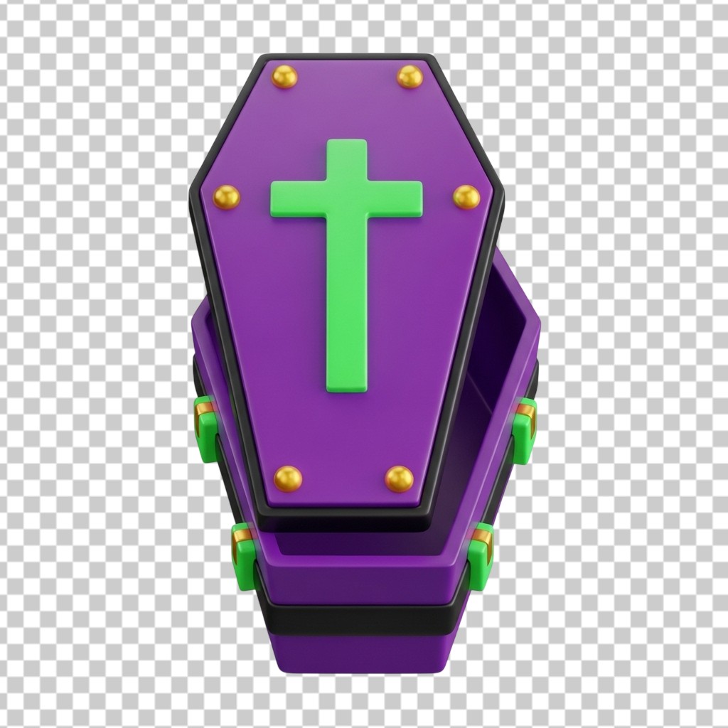 3D Spooky Halloween Purple Coffin with Green Cross PNG Transparent Background
