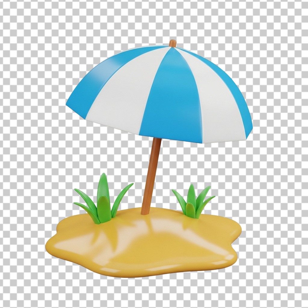 3D Tropical Beach Scene with Blue Umbrella on Sand PNG Transparent Background